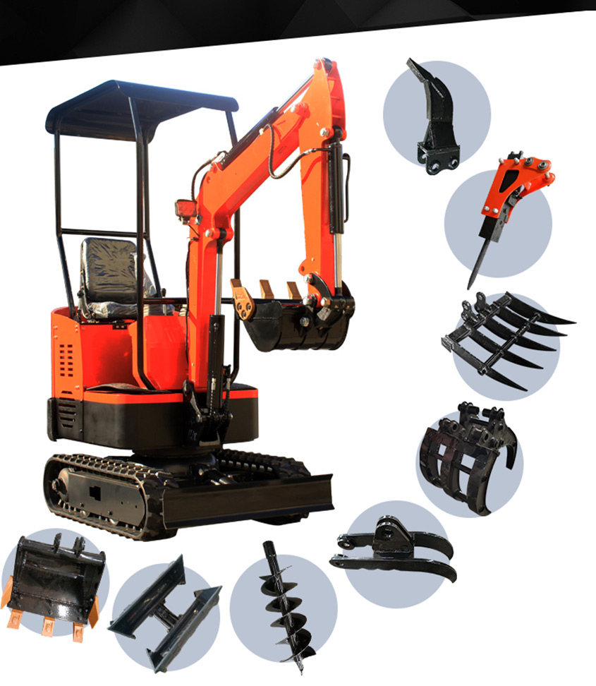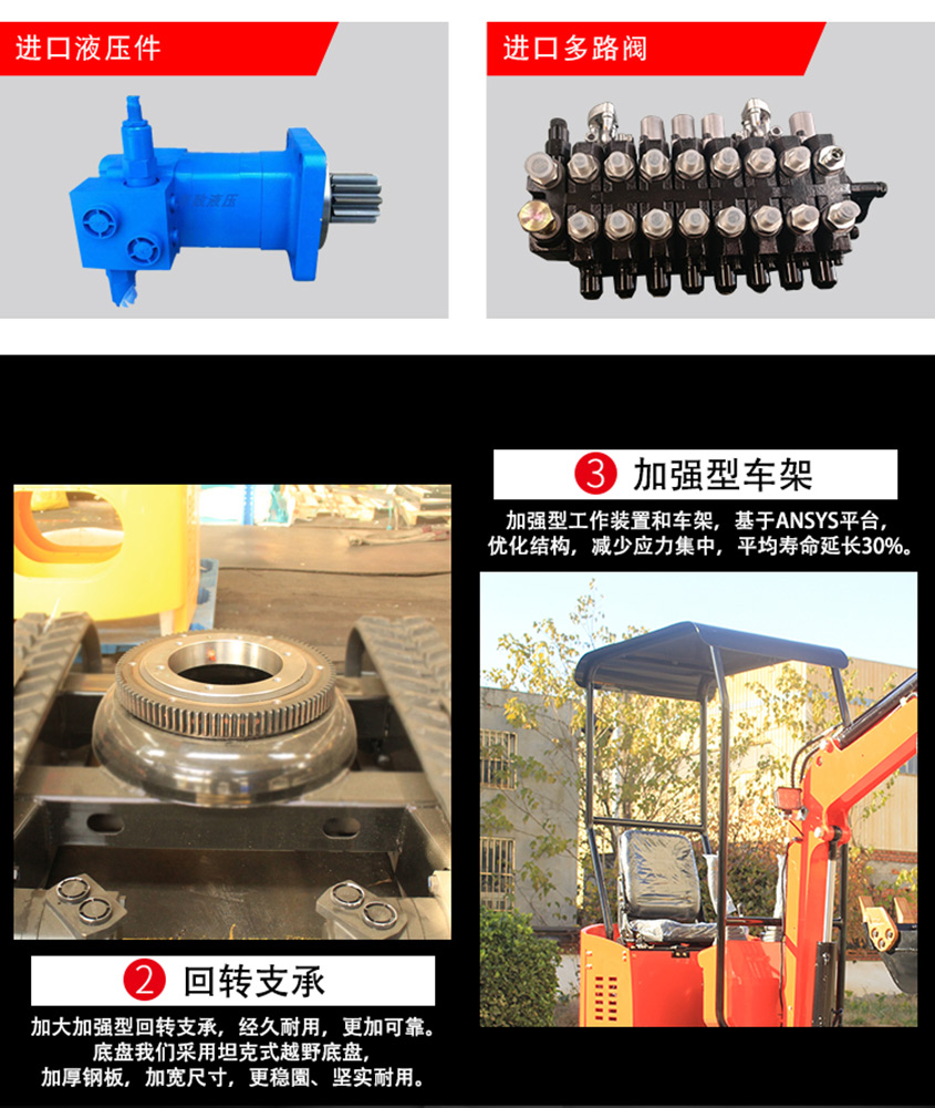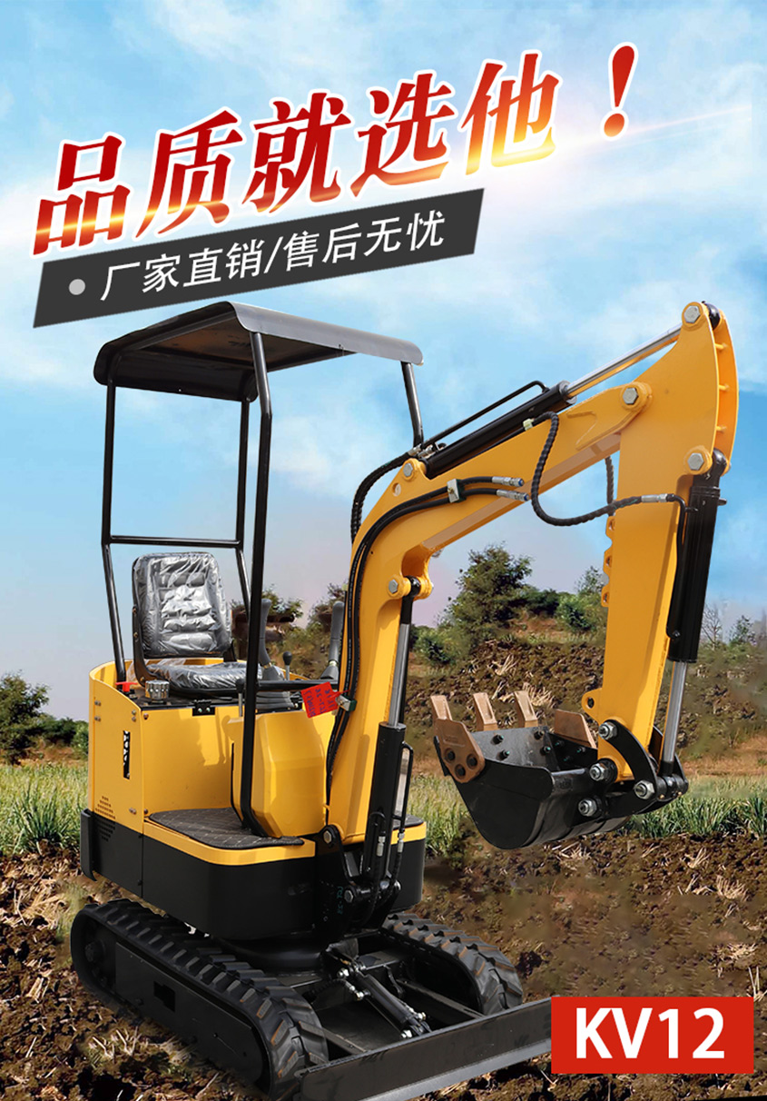 凱迪沃KV12農用挖溝水道農田果園大棚專用小型挖掘機可選配旋挖鉆、破碎錘、裝載斗、抓木器、耙子、松土器、等各種屬具,大架子(底盤和平臺)加固,整車有力,加大實心配重,挖掘機有力,穩定性高.
